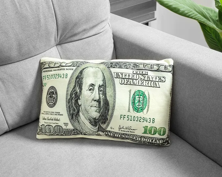 Poduszka „Sto dolarów". Dodaj odrobinę luksusu i humoru do swojego wnętrza! Ta stylowa poduszka z nadrukiem 100 dolarów to nie tylko świetny akcent dekoracyjny, ale również subtelne przypomnienie, jak cenne są chwile odpoczynku. W świecie inflacji, gdzie wartość pieniądza maleje, ta poduszka zachowuje swoją „wartość” – jest niezastąpiona w tworzeniu komfortowej przestrzeni relaksu.