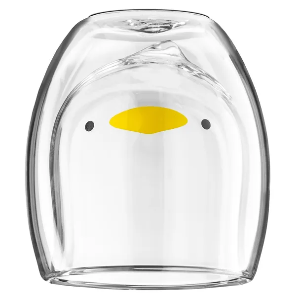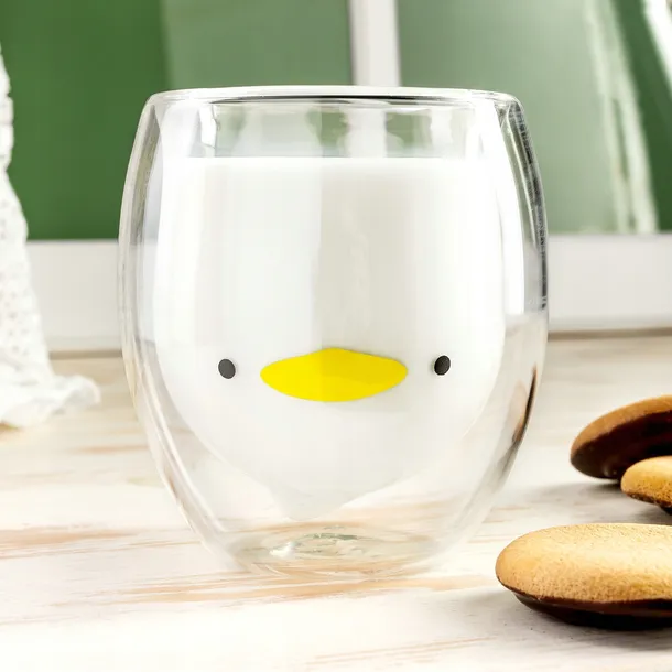 Sympatyczna szklanka z wnętrzem w kształcie kaczki z wesołym czubkiem, nie tylko dla dzieci, choć one pokochają ją najbardziej. Z podwójnymi ściankami dla większego komfortu :) Gorąca herbata, kawa, mleko czy kakao nie będą już parzyć w palce, a zimny napój na dłużej pozostanie przyjemnie schłodzony. Nadruk na szklance oraz jej wewnętrzny kształt najlepiej widać po wypełnieniu jej napojem.